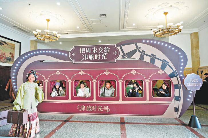近日,“津旅时光号”旅游专列从北京站开往天津北站,位于北京站的主题展板成为旅客的打卡点。