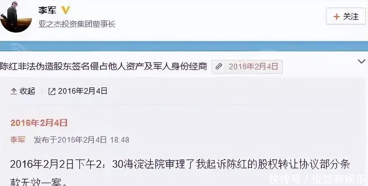 2015年,前夫李军在微博上一通长文,直言不讳地揭露了陈红的“真实面目”。